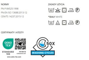 Tkanina spełnia wymagania normy CEN/TS 14237:2015-12 – Tekstylia w systemie ochrony zdrowia, co gwarantuje najwyższy poziom bezpieczeństwa i funkcjonalności.